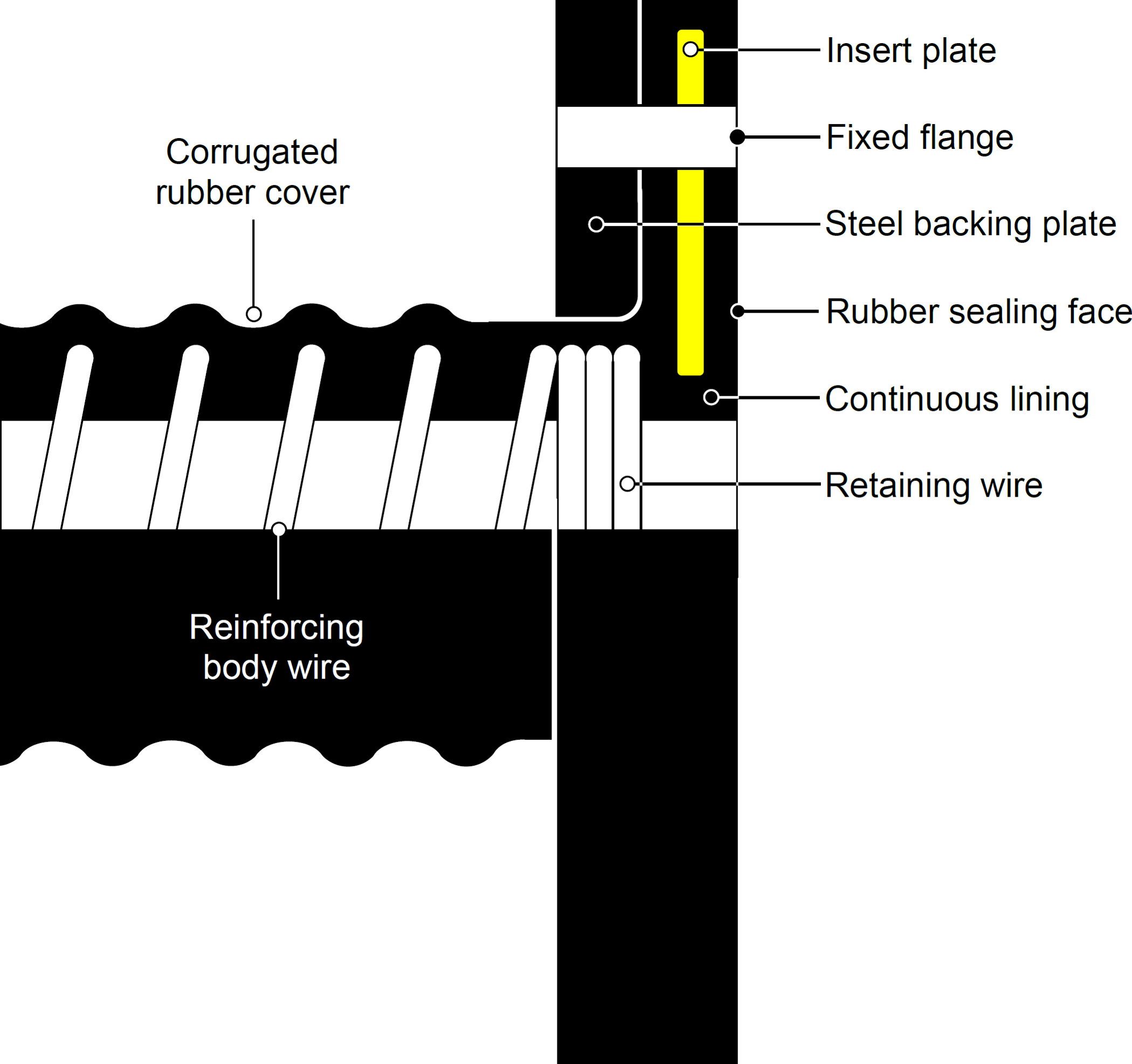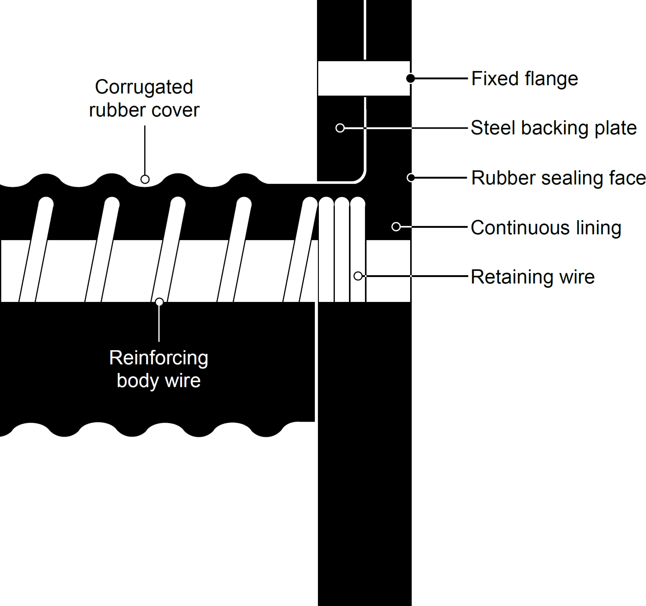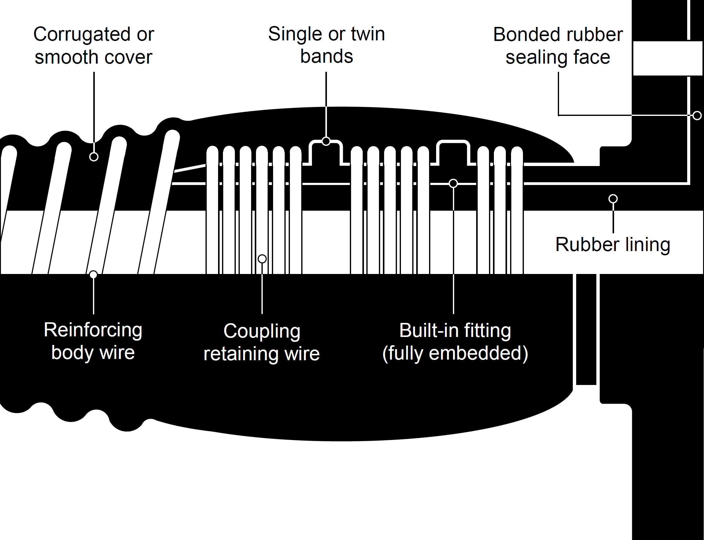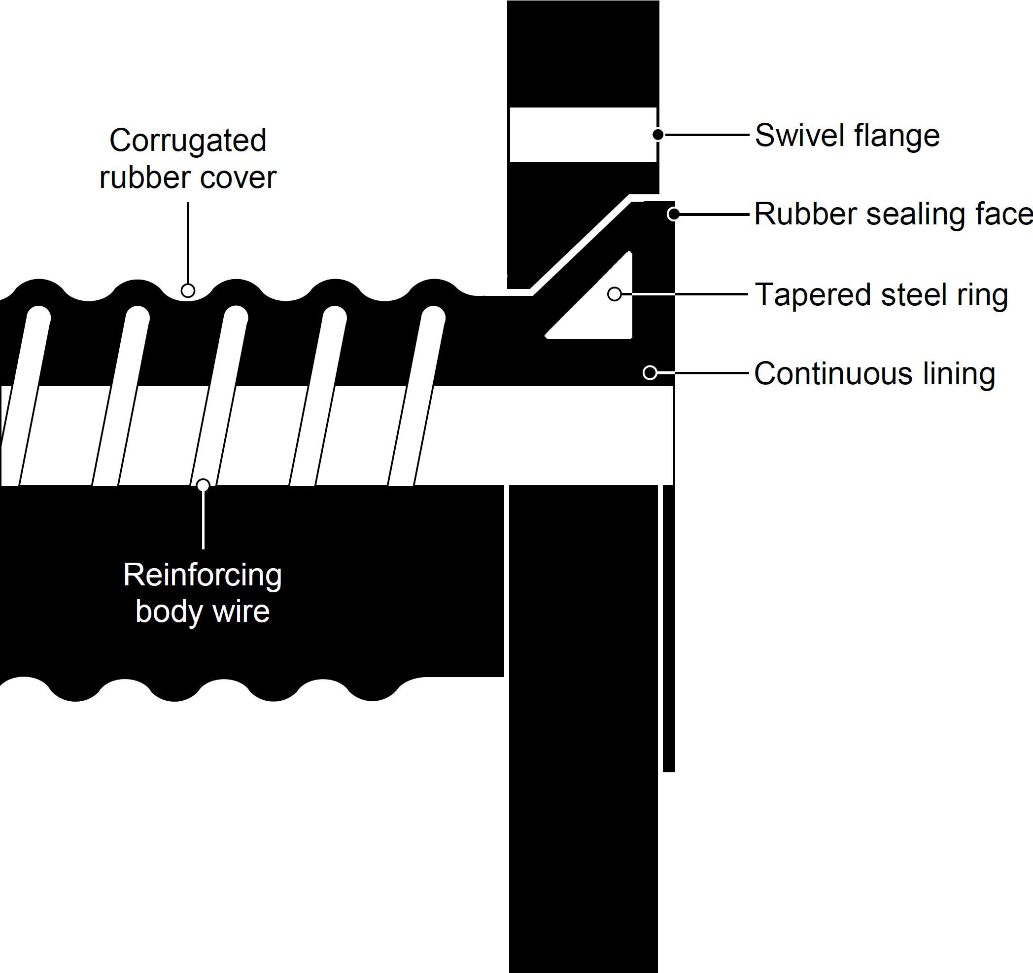 Built-in fitting ![]() Built-in full-bore coupling system for medium to high pressure; non-corrosive and non-abrasive applications. Metal fittings are built into the hose ends during manufacture to form an integral part of the assembly. No external wire or clamps are required as the fitting is chemically-bonded into the hose and mechanically-locked with wire which is embedded in the hose wall between single or double cope rings; securely retaining the fitting in position. Read more.. Built-in rubber lined (fully embedded) ![]() Built-in rubber lined full-bore coupling system for medium to high pressure; corrosive and abrasive applications. Metal fittings are built and vulcanised into the hose ends during manufacture to form an integral part of the assembly. The fitting is encapsulated in rubber thus exhibiting a metal free lining. No external wire or clamps are required as the fitting is chemically bonded and mechanically locked into the hose. An embedded wire retains the fitting firmly in position between single or double cope rings. This system can be designed for the smallest possible pitch circle diameters and is recommended for very heavy-duty applications. Read more.. Integral fixed flange ![]() Integral full-bore coupling system for low to medium pressure; corrosive and abrasive applications. Reinforcing tyre cord plies, encapsulated in rubber continue at right angles against the hose body into a flange. A steel backing plate supports the flange. Elimination of a conventional hose tail allows the hose to begin flexing immediately behind the flange; which is useful for applications requiring a tight bend radius and a more uniform curvature. The backing plate is vulcanised to the rubber and fabric flange; creating a one-piece unit. This system eliminates the necessity of a gasket yet provides a fluid tight seal. The system can be incorporated into any hose type where a smooth uninterrupted through-bore is required. A rubber lining end-to-end ensures that the conveyant has no contact with metal parts. Read more.. Double-action integral fixed flange ![]() Double-action flange is a further development of the integral flange. This system incorporates an additional embedded steel insert plate within the flange structure. This resolves many of the problems associated with pressure pulsation and/or end load/stretch. This system reduces flange bending and loss of sealing at higher pressures especially on flange drillings with a wide pitch circle diameter. Read more.. Beaded end swivel flange ![]() Beaded end full-bore coupling system for medium to high pressure; corrosive and abrasive applications. A steel 'wedge' section ring is fully encapsulated in rubber and fabric to create a bead. A one-piece rotatable flange sits on the body of the hose against and on top of this bead. Elimination of a conventional hose tail allows the hose to begin flexing immediately behind the flange. This is useful for short hoses requiring a tight bend radius and a more uniform curvature. A beaded end is capable of significant end-loading. Read more.. Internally swaged Full-bore coupling system for medium to high pressure; non-corrosive and non-abrasive applications. Modern industrial applications frequently require increasingly high operating pressures. In order to comply with this, swaging techniques have been developed for hose sizes beyond those commonly found in hydraulic systems. Internal swaging provides a full-flow internal diameter free from steps at the hose tail. A process by which the embedding wire is terminated a set distance from the hose ends. Designed to accommodate a hose tail which can be clipped-in, wired-in or strapped-in. Reinforcing fabrics can be protected from corrosion and contamination by rubber 'capping' the ends of the hose; the reinforcement is terminated a nominal distance from the end of the cuff giving the impression of a solid rubber tube. A process by which the hose ends are 'belled' out to create a larger internal diameter than the bore of the hose to facilitate the insertion of fittings where a uninterrupted through-bore assembly is required. Like a plain cuffed end, the embedding wire is terminated a set distance from the hose ends to accommodate a hose tail which can be clipped-in, wired-in or strapped-in. Reinforcing fabrics can be protected from corrosion and contamination by rubber 'capping' the ends of the hose; the reinforcement is terminated a nominal distance from the end of the cuff giving the impression of a solid rubber tube. |